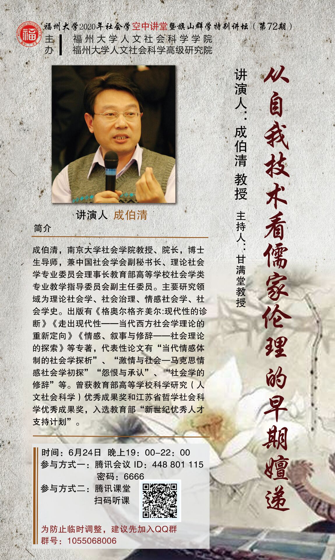 演講人簡介:成伯清(1966-),南京大學社會學院教授、院長、博士生導師,校學位委員會委員,兼中國社會學會副秘書長,理論社會學分會候任會長。入選教育部“新世紀優秀人才計劃”。主要研究領域為理論社會學、情感社會學、社會學史。主要代表著作有:《情感、敘事與修辭——社會理論的探索》(2012)。在《社會學研究》、《社會》、《南京社會科學》、《探索與爭鳴》等學術刊物上發表論文數十篇。