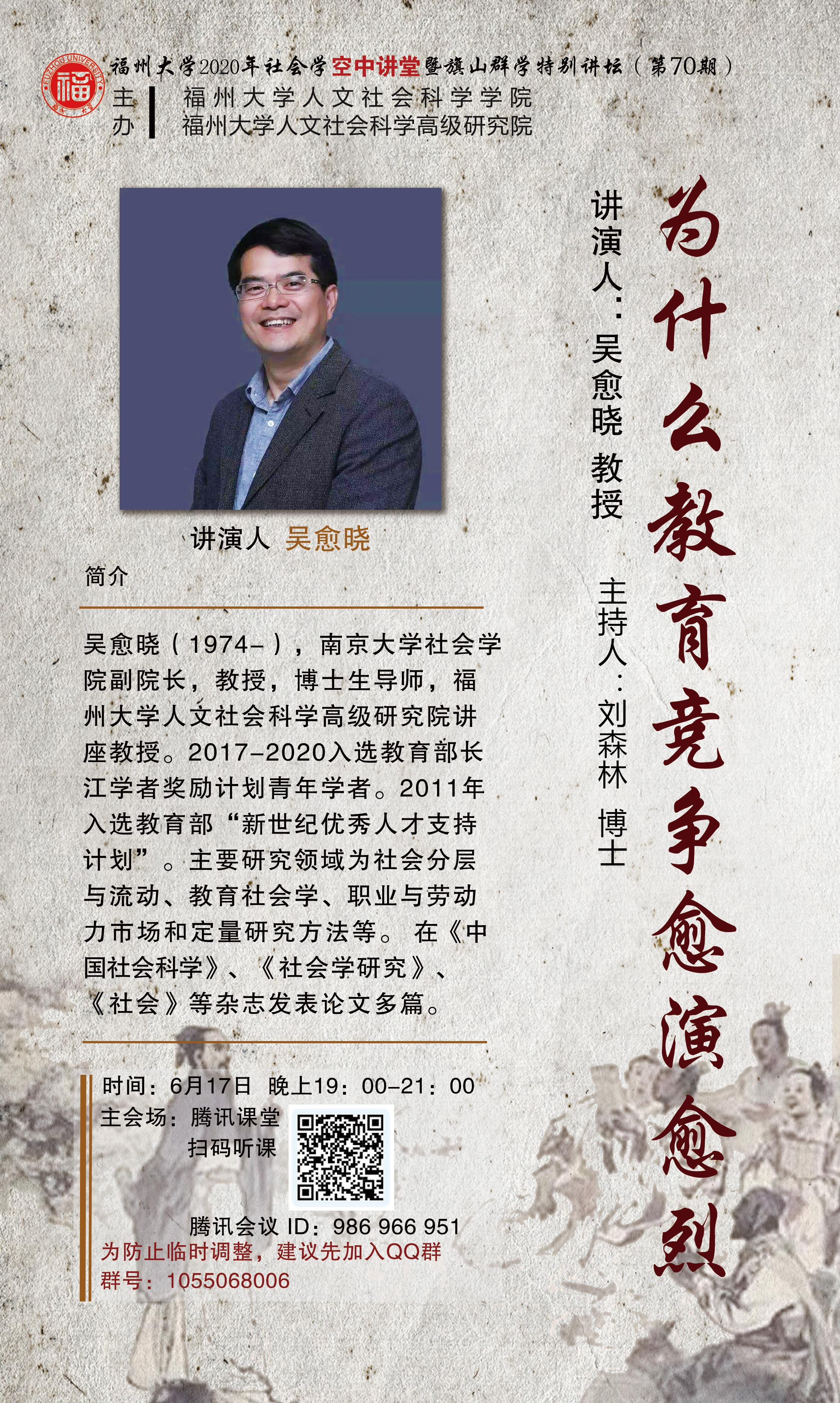 演講人簡介:吳愈曉(1974-),南京大學社會學院副院長,教授,博士生導師,福州大學人文社會科學高級研究院講座教授。2017-2020入選教育部長江學者獎勵計劃青年學者。2011年入選教育部“新世紀優(yōu)秀人才支持計劃”。主要研究領域為社會分層與流動、教育社會學、職業(yè)與勞動力市場和定量研究方法等。在《中國社會科學》、《社會學研究》、《社會》以及Sociological Perspectives等雜志發(fā)表論文多篇。
