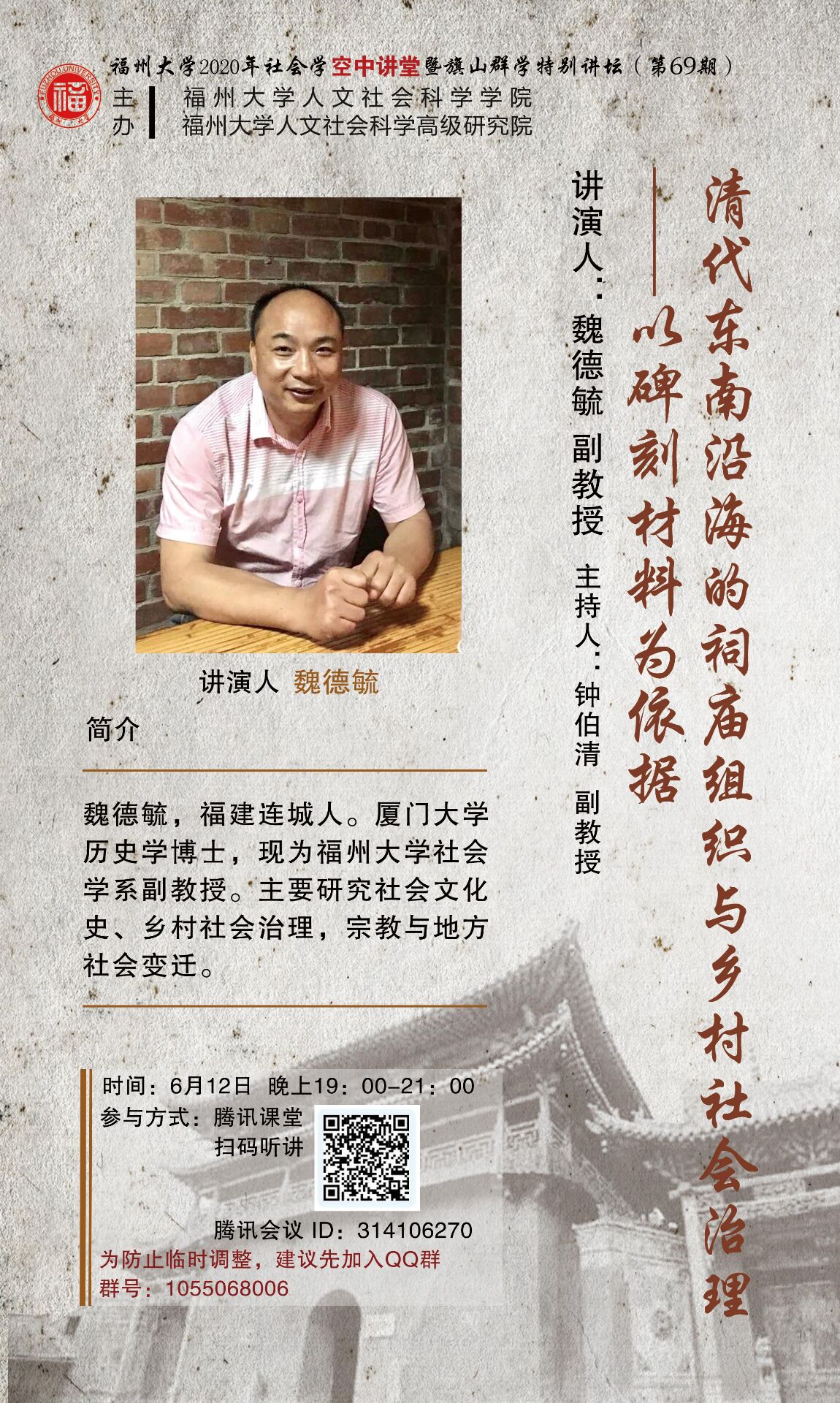 演講人簡介:魏德毓,福建連城人。廈門大學歷史學博士,現(xiàn)為福州大學社會學系副教授。主要研究社會文化史、鄉(xiāng)村社會治理,宗教與地方社會變遷。