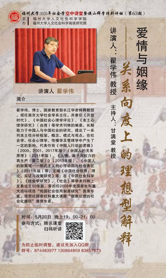 演講人簡介:翟學偉: 博士,國家教育部長江學者特聘教授?,F任南京大學社會學系主任,并兼任《開放時代》、《中國社會心理學評論》、《本土心理學研究》(臺灣)等學術刊物的編委。長期致力于中國人與中國社會的研究,提出了一系列本土性分析框架、概念、模式與觀點。在社會學、社會心理學、傳播學及管理學中產生了一定的影響,代表作有《中國人行動的邏輯》(2000,2001,2017年版)《中國人的關系原理》(2011年版)、《人情、面子與權力的再生產(第二版)》(2013年版)、《中國人的臉面觀——形式主義的心理動因與社會表征》(2011年版)等,主編《中國社會信用:理論、實證與政策研究》等;在《中國社會科學》、《社會學研究》、《社會》等學術刊物上發表論文50余篇。曾擔任2009年度國家社科重大招標項目“我國社會信用制度研究”首席專家,現擔任國家社科重大課題“儒家倫理的社會化路徑”首席專家。
