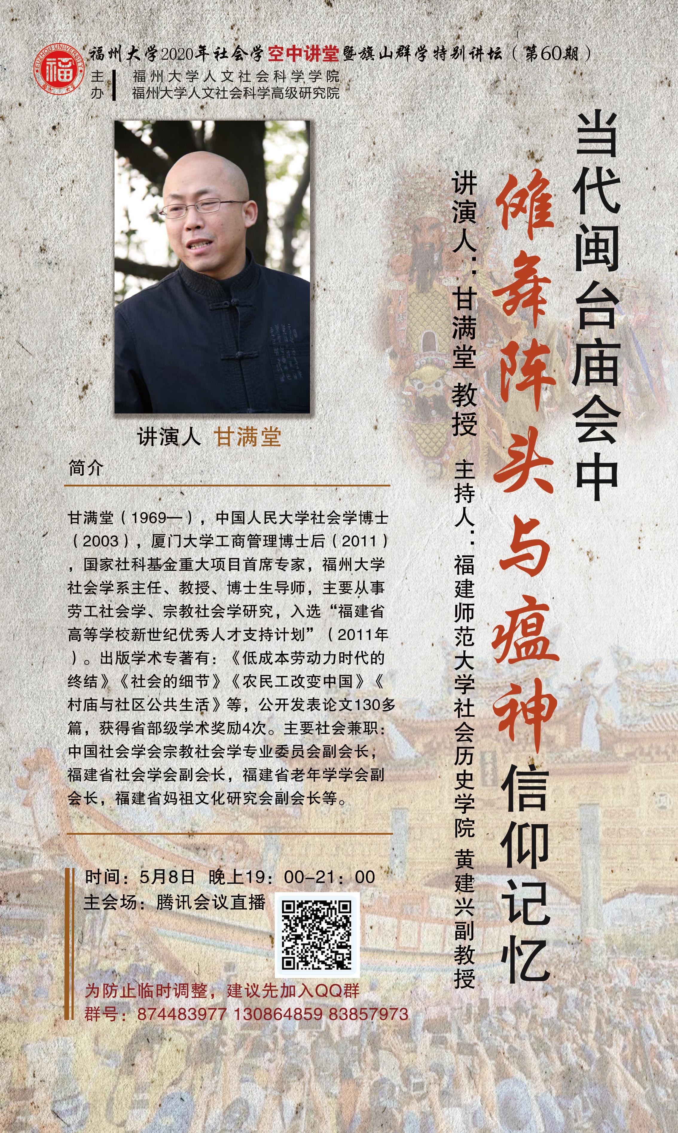 演講人簡介:甘滿堂(1969—),中國人民大學(xué)社會(huì)學(xué)博士(2003),廈門大學(xué)工商管理博士后(2011),國家社科基金重大項(xiàng)目首席專家,福州大學(xué)社會(huì)學(xué)系主任、教授、博士生導(dǎo)師,主要從事勞工社會(huì)學(xué)、宗教社會(huì)學(xué)研究,入選“福建省高等學(xué)校新世紀(jì)優(yōu)秀人才支持計(jì)劃”(2011年)。出版學(xué)術(shù)專著有:《低成本勞動(dòng)力時(shí)代的終結(jié)》《社會(huì)的細(xì)節(jié)》《農(nóng)民工改變中國》《村廟與社區(qū)公共生活》等,公開發(fā)表論文130多篇,獲得省部級(jí)學(xué)術(shù)獎(jiǎng)勵(lì)4次。